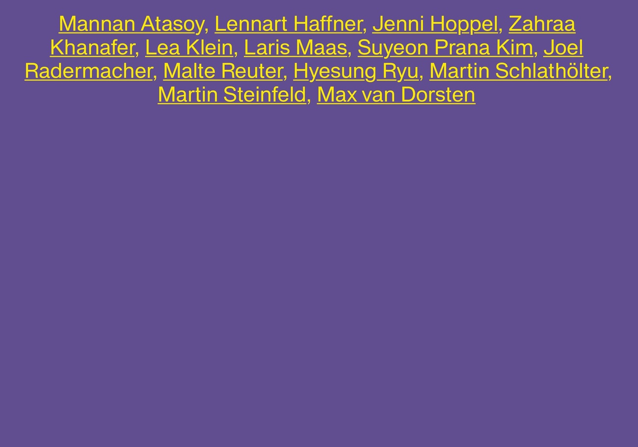 CreditZum 41. Mal findet die Förderpreisausstellung der Freunde der Kunstakademie Münster statt, die insgesamt 13 künstlerische Positionen zeigt: Mannan Atasoy, Lennart Haffner, Jenni Hoppel, Zahraa Khanafer, Lea Klein, Laris Maas, Suyeon Prana Kim, Joel Radermacher, Malte Reuter, Hyesung Ryu, Martin Schlathölter, Martin Steinfeld, Max van Dorsten.