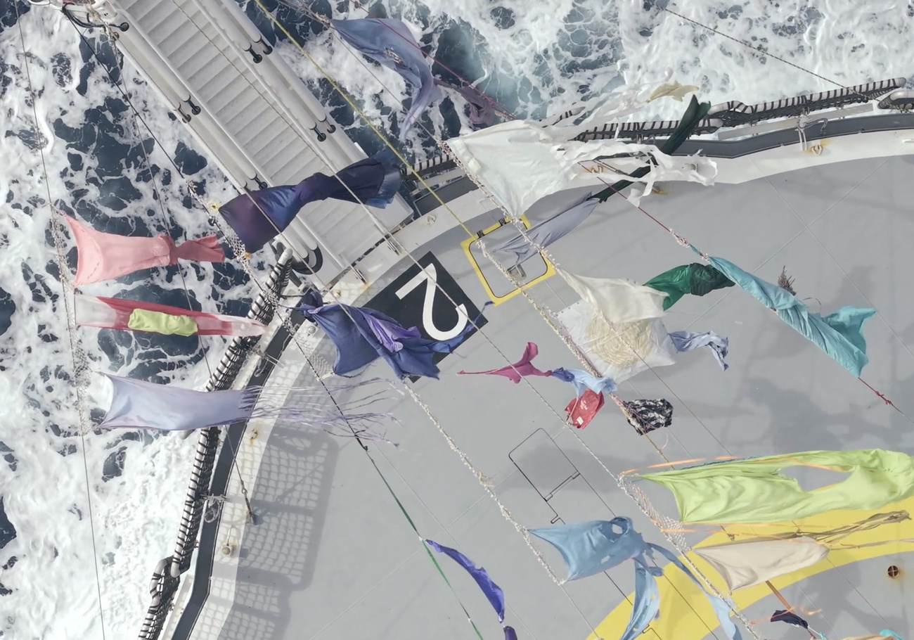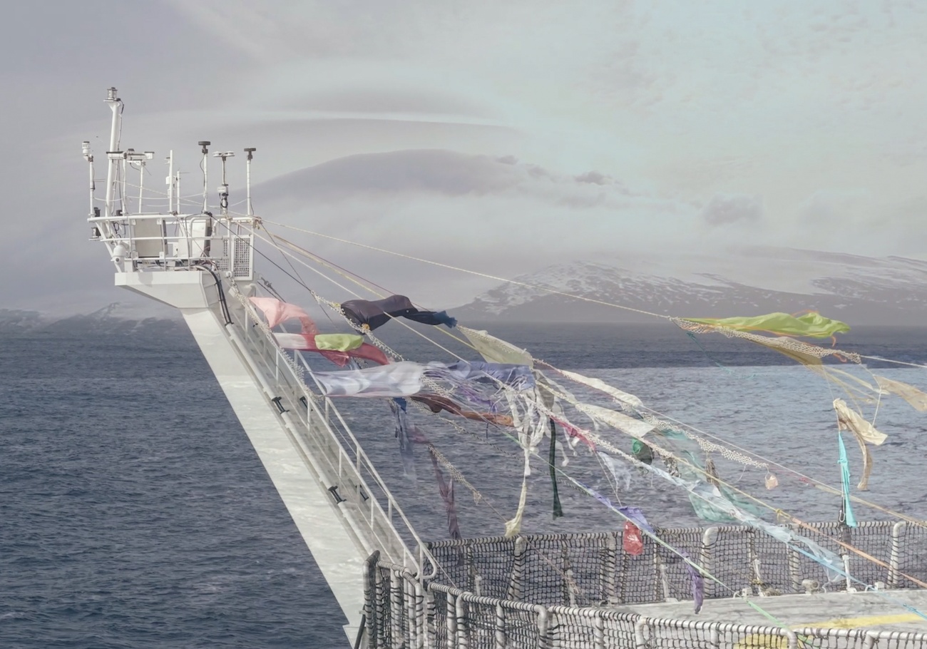 Entstanden ist die Installation in ihren Grundzügen während Tharrats Reise zu den Südlichen Sandwichinseln als Artist-at-Sea auf dem Expeditionsschiff R/V Falklor (too) des Schmidt Ocean Institutes. In der Berührung mit der Natur, in Zusammenarbeit mit dem Wind, wurde ein Großteil der Fahnen entwickelt, die in der Kunsthalle in den Raum übersetzt wurden und dort aufgespannt waren oder schlaff von der Decke hingen. In der Ausstellung wurde die Installation mehrfach durch Performer:innen aktiviert, die sie mit ihren Stimmen, durch Atemübungen und das Spielen von Windinstrumenten in Bewegung versetzt haben.